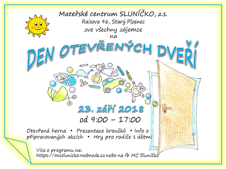 V týdnu od 24.9.2018 do 27.9.2018 budou všechny akce a herna v MC Sluníčko zdarma, pouze za dobrovolné vstupné. Přijďte se k nám podívat na ukázky různých kroužků a prošmejdit celé prostory MC Sluníčka! :)
