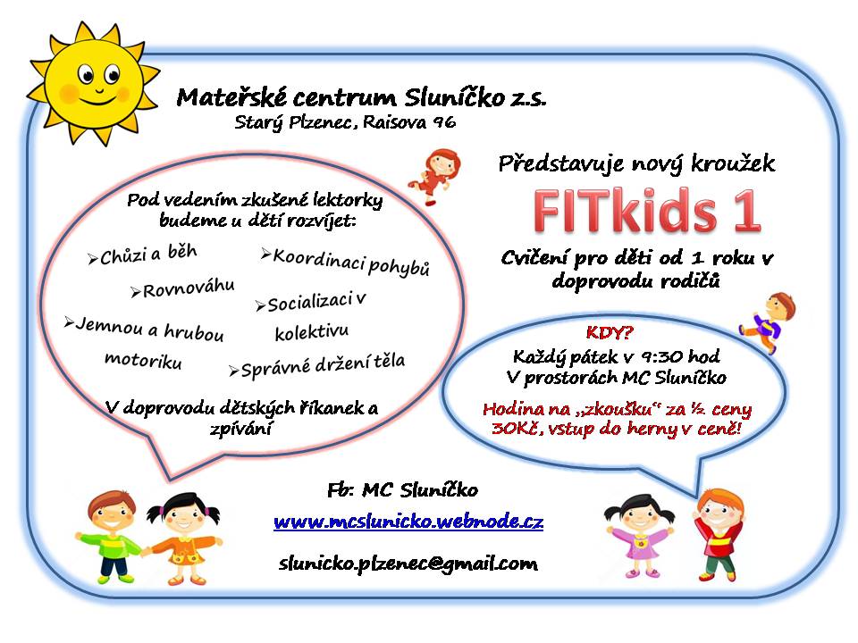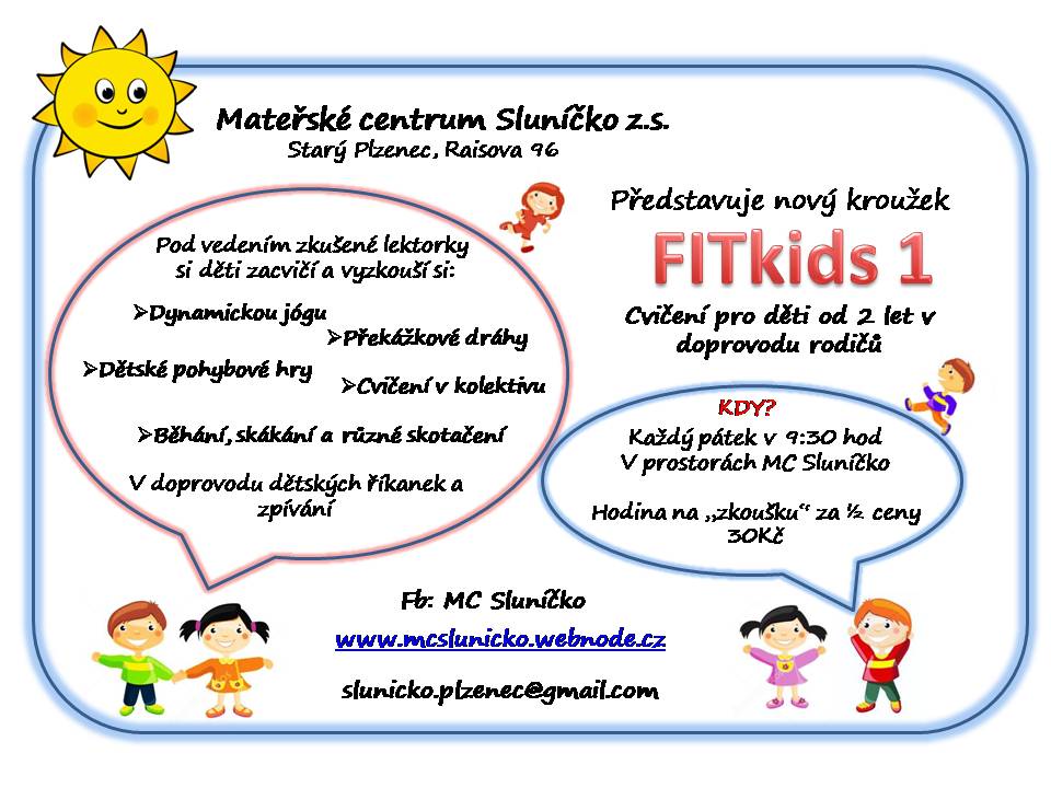 Ukázka nového kroužku FITkids 1, který vede zkušená lektorka proběhne v pátek 26.10 v prostorách MC Sluníčko. Vezměte s sebou přezůvky pro sebe i své děti. První hodina "na zkoušku" za 30kč, ostatní hodiny za 60Kč. Více info na plakátku a v sekci Kroužky. :)