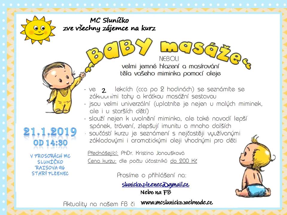 Budeme masírovat přímo miminka, s sebou si vezměte deku, savou podložku a mističku na olej, který zajistíme my.